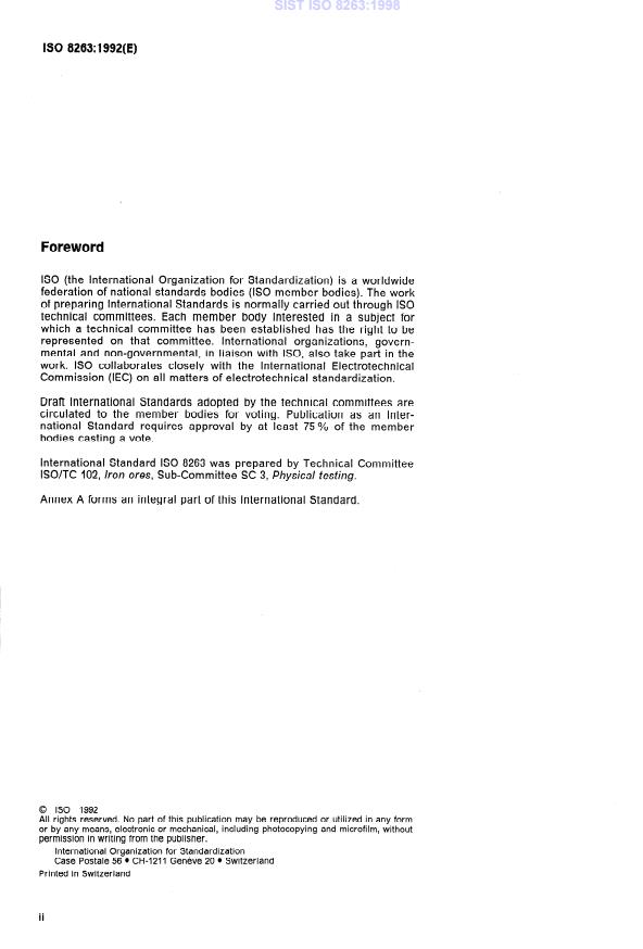 ISO 8263:1992 is a standard published by the International Organization for Standardization (ISO). Its full title is "Iron ore fines - Method for presentation of the results of sintering tests". This standard covers: Applicable to all iron ore fines that are agglomerated by the sintering process. Figure 1 gives an example of sintering test equipment, Figure 2 the flowsheet of typical sinter test procedure. Annex A lists international standards specifying the relevant test methods.