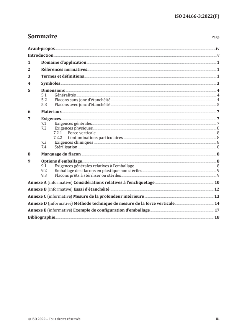 ISO 24166-3:2022 defines the shape, dimensions, fill capacities and performance requirements for plastic snap‑on bottles intended for use with metering pumps in medicinal applications. The standard covers material selection, neck finishes (with or without a sealing ring), brimful capacities for standard sizes (e.g., 5P–100P), manufacturing tolerances, packaging options (nonsterile, ready‑to‑sterilize, sterile) and relevant test methods. It is part of the ISO 24166 series and references packaging validation requirements such as ISO 11607‑1/2.