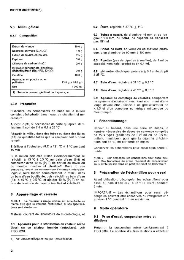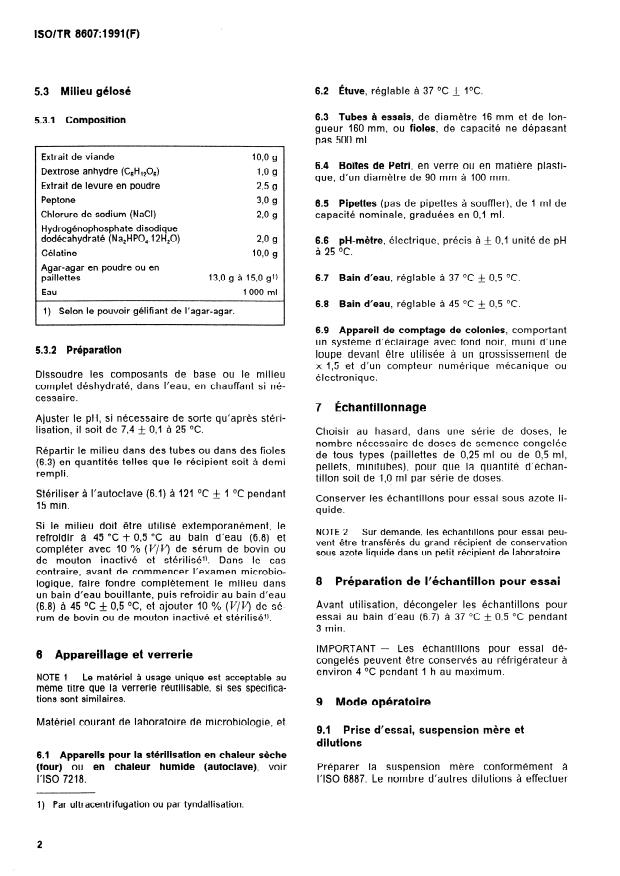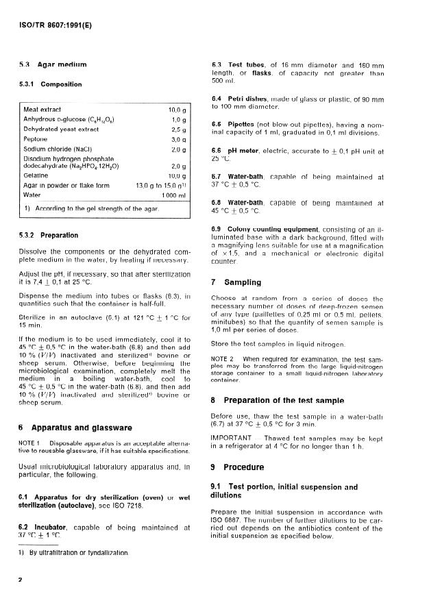 ISO/TR 8607:1991 is a technical report published by the International Organization for Standardization (ISO). Its full title is "Artificial insemination of animals — Frozen semen of breeding bulls — Enumeration of living aerobic micro-organisms". This standard covers: The method described counts the colonies obtained in a solid medium after aerobic incubation at 37 °C. Specifies normative references, definitions, principle, culture medium and diluent, apparatus and glassware, sampling, preparation of the test sample, procedure, expression of results, repeatability and test report.