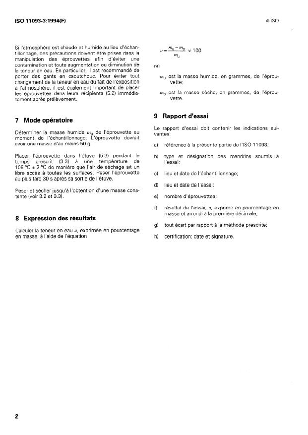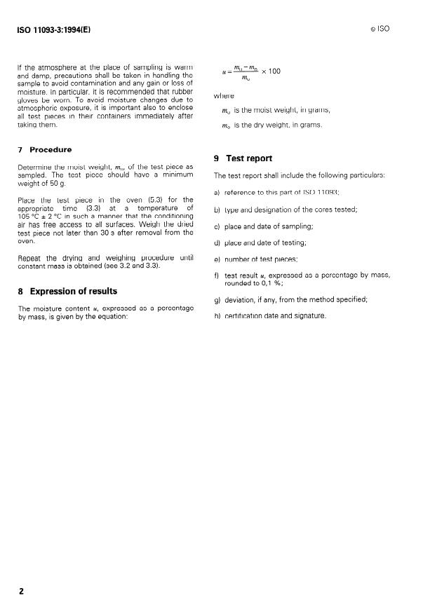 - Reporting: Include reference to ISO 11093-3, core type/designation, place/date of sampling and testing, number of test pieces, moisture result rounded to 0.1%, any deviations, and certification/signature.