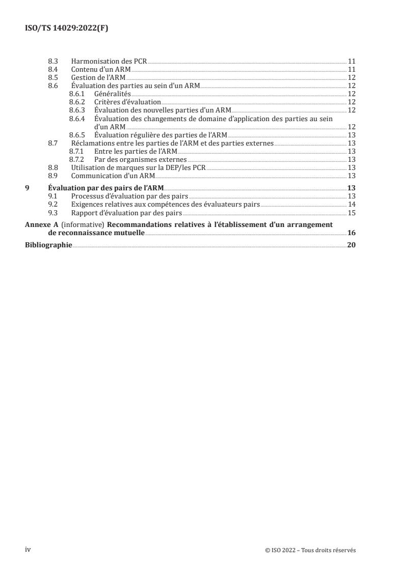 Le présent document spécifie les exigences relatives aux arrangements de reconnaissance mutuelle (ARM) et fournit des recommandations relatives à la façon d’initier le développement d’ARM entre les opérateurs de programmes de communication d’empreinte et de déclarations environnementales de produits (DEP). Il traite des tâches administratives et opérationnelles, par l’évaluation de tels programmes, et de la façon de communiquer vers des parties externes les résultats de la coopération ainsi que les plans pour les futures activités associées. Le présent document s’applique principalement aux ARM, mais il peut également constituer la base d’arrangements bilatéraux.