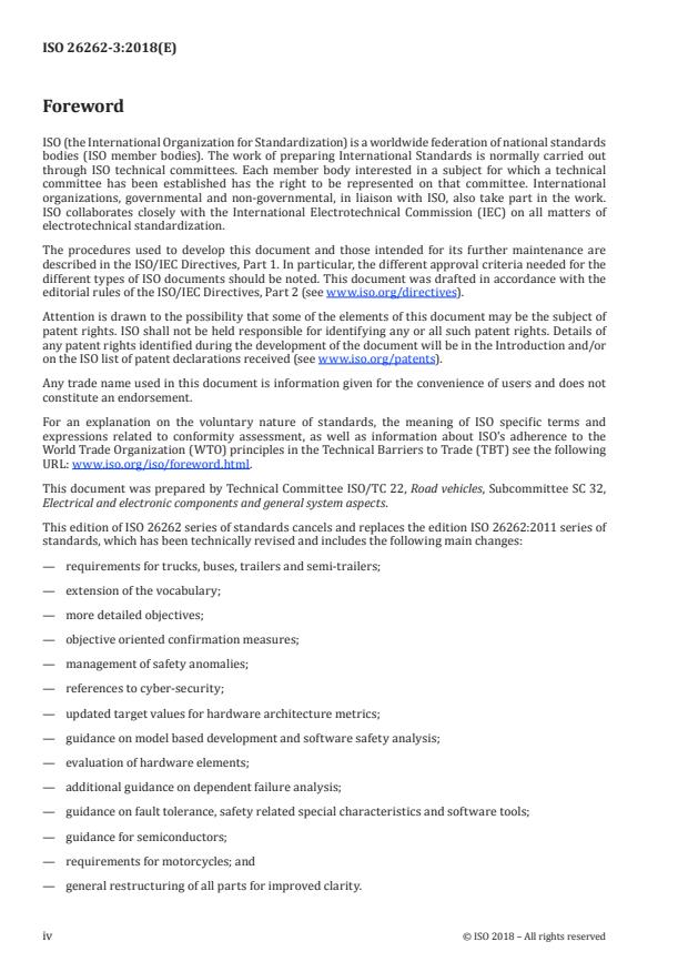 ISO 26262-3:2018 is a standard published by the International Organization for Standardization (ISO). Its full title is "Road vehicles — Functional safety — Part 3: Concept phase". This standard covers: This document is intended to be applied to safety-related systems that include one or more electrical and/or electronic (E/E) systems and that are installed in series production road vehicles, excluding mopeds. This document does not address unique E/E systems in special vehicles such as E/E systems designed for drivers with disabilities. NOTE Other dedicated application-specific safety standards exist and can complement the ISO 26262 series of standards or vice versa. Systems and their components released for production, or systems and their components already under development prior to the publication date of this document, are exempted from the scope of this edition. This document addresses alterations to existing systems and their components released for production prior to the publication of this document by tailoring the safety lifecycle depending on the alteration. This document addresses integration of existing systems not developed according to this document and systems developed according to this document by tailoring the safety lifecycle. This document addresses possible hazards caused by malfunctioning behaviour of safety-related E/E systems, including interaction of these systems. It does not address hazards related to electric shock, fire, smoke, heat, radiation, toxicity, flammability, reactivity, corrosion, release of energy and similar hazards, unless directly caused by malfunctioning behaviour of safety-related E/E systems. This document describes a framework for functional safety to assist the development of safety-related E/E systems. This framework is intended to be used to integrate functional safety activities into a company-specific development framework. Some requirements have a clear technical focus to implement functional safety into a product; others address the development process and can therefore be seen as process requirements in order to demonstrate the capability of an organization with respect to functional safety. This document does not address the nominal performance of E/E systems. This document specifies the requirements for the concept phase for automotive applications, including the following: — item definition; — hazard analysis and risk assessment; and — functional safety concept. Annex A provides an overview on objectives, prerequisites and work products of this document.