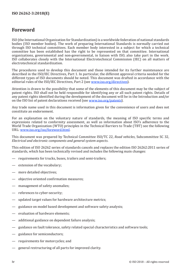 ISO 26262-3:2018 is a standard published by the International Organization for Standardization (ISO). Its full title is "Road vehicles - Functional safety - Part 3: Concept phase". This standard covers: This document is intended to be applied to safety-related systems that include one or more electrical and/or electronic (E/E) systems and that are installed in series production road vehicles, excluding mopeds. This document does not address unique E/E systems in special vehicles such as E/E systems designed for drivers with disabilities. NOTE Other dedicated application-specific safety standards exist and can complement the ISO 26262 series of standards or vice versa. Systems and their components released for production, or systems and their components already under development prior to the publication date of this document, are exempted from the scope of this edition. This document addresses alterations to existing systems and their components released for production prior to the publication of this document by tailoring the safety lifecycle depending on the alteration. This document addresses integration of existing systems not developed according to this document and systems developed according to this document by tailoring the safety lifecycle. This document addresses possible hazards caused by malfunctioning behaviour of safety-related E/E systems, including interaction of these systems. It does not address hazards related to electric shock, fire, smoke, heat, radiation, toxicity, flammability, reactivity, corrosion, release of energy and similar hazards, unless directly caused by malfunctioning behaviour of safety-related E/E systems. This document describes a framework for functional safety to assist the development of safety-related E/E systems. This framework is intended to be used to integrate functional safety activities into a company-specific development framework. Some requirements have a clear technical focus to implement functional safety into a product; others address the development process and can therefore be seen as process requirements in order to demonstrate the capability of an organization with respect to functional safety. This document does not address the nominal performance of E/E systems. This document specifies the requirements for the concept phase for automotive applications, including the following: - item definition; - hazard analysis and risk assessment; and - functional safety concept. Annex A provides an overview on objectives, prerequisites and work products of this document.