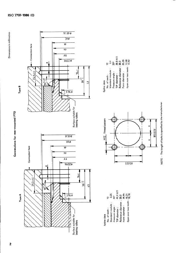 - Essential dimensions: ISO 7707 specifies the critical mounting and interface dimensions for rear-mounted PTOs to ensure interchangeability and correct mechanical fit. Illustrative drawings provide reference measures and mounting layouts.