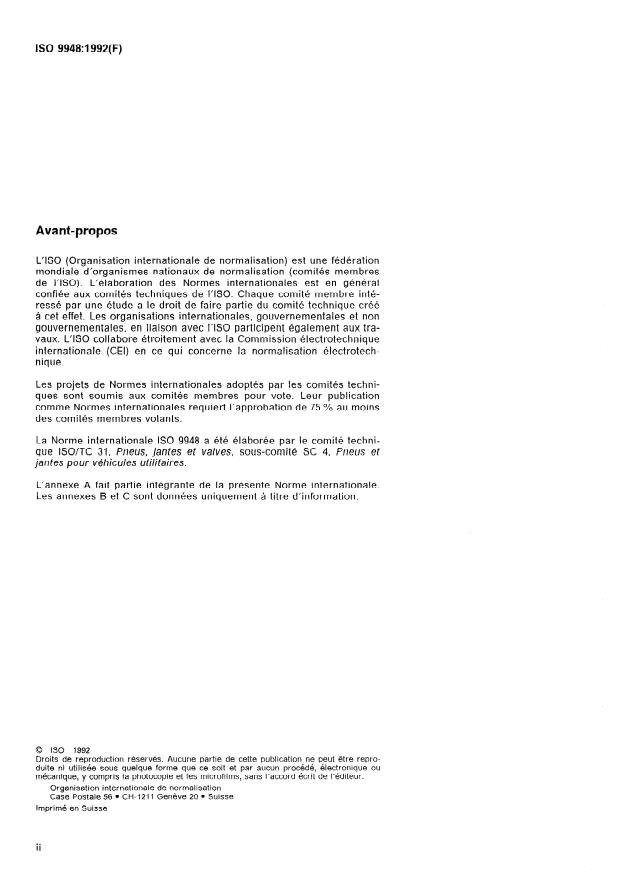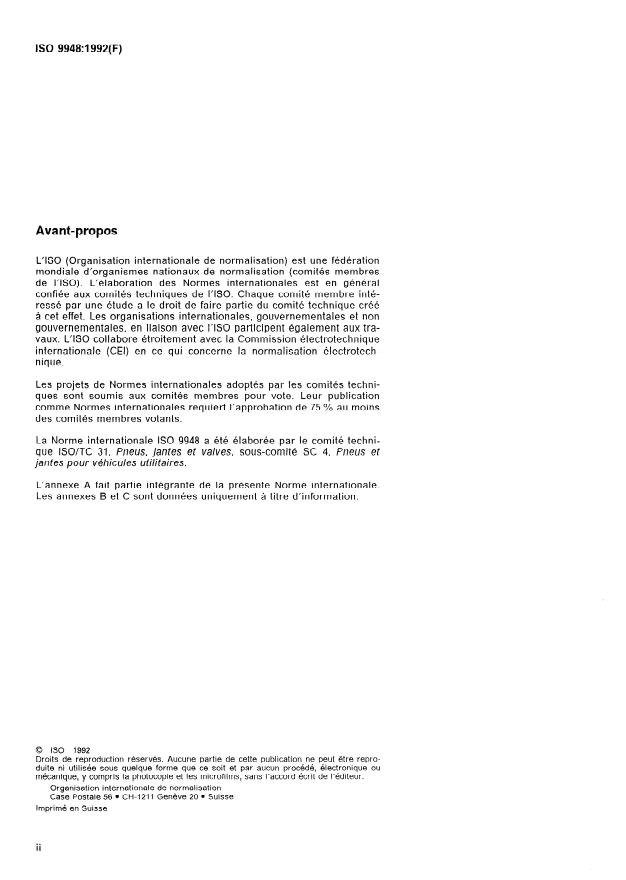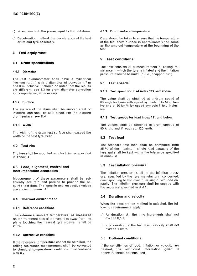 ISO 9948:1992 is a standard published by the International Organization for Standardization (ISO). Its full title is "Truck and bus tyres — Methods of measuring rolling resistance". This standard covers: Applies to all truck and bus pneumatic tyres. In measuring tyre rolling resistance, it is necessary to measure small forces in the presence of much larger forces. It is, therefore, essential that equipment and instrumentation of appropriate accuracy be used. Annex A gives test equipment tolerances, annexes B and C (informative) describe optional test conditions and measurement methods of moment of inertia.