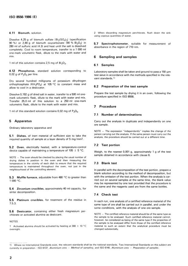 ISO 8556:1986 is a standard published by the International Organization for Standardization (ISO). Its full title is "Aluminium ores — Determination of phosphorus content — Molybdenum blue spectrophotometric method". This standard covers: The method is applicable to materials having phosphorus contents, expressed as diphosphorus pentoxide between 0,01 and 5 % (m/m). The arsenic content of the sample does not affect the determination. Specifies principle, reagents, apparatus, sampling and samples, procedure, expression of results and test report. An annex shows the flowsheet of the procedure for the acceptance of test results.