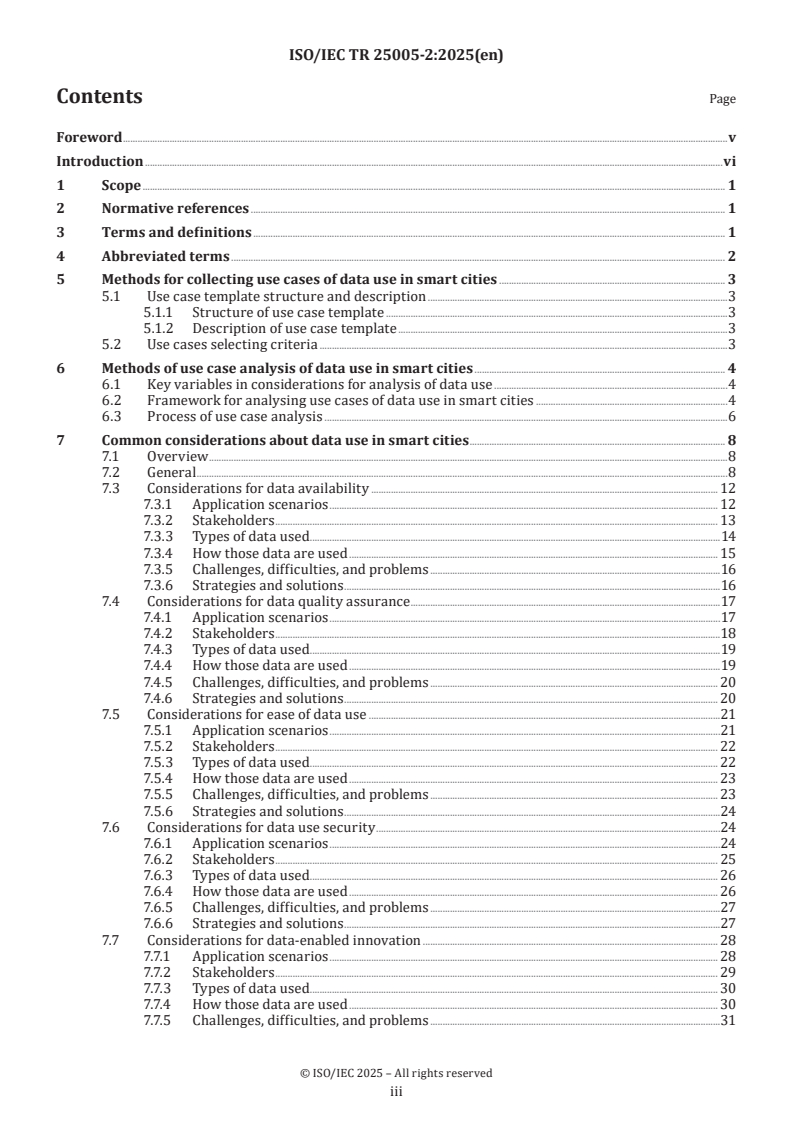 This Technical Report complements ISO/IEC standards on information technology, data governance and smart city interoperability. Relevant search terms for discoverability include: ISO/IEC TR 25005-2:2025, data use in smart cities, use case analysis, data governance, data quality, data security, data availability, and data-enabled innovation.