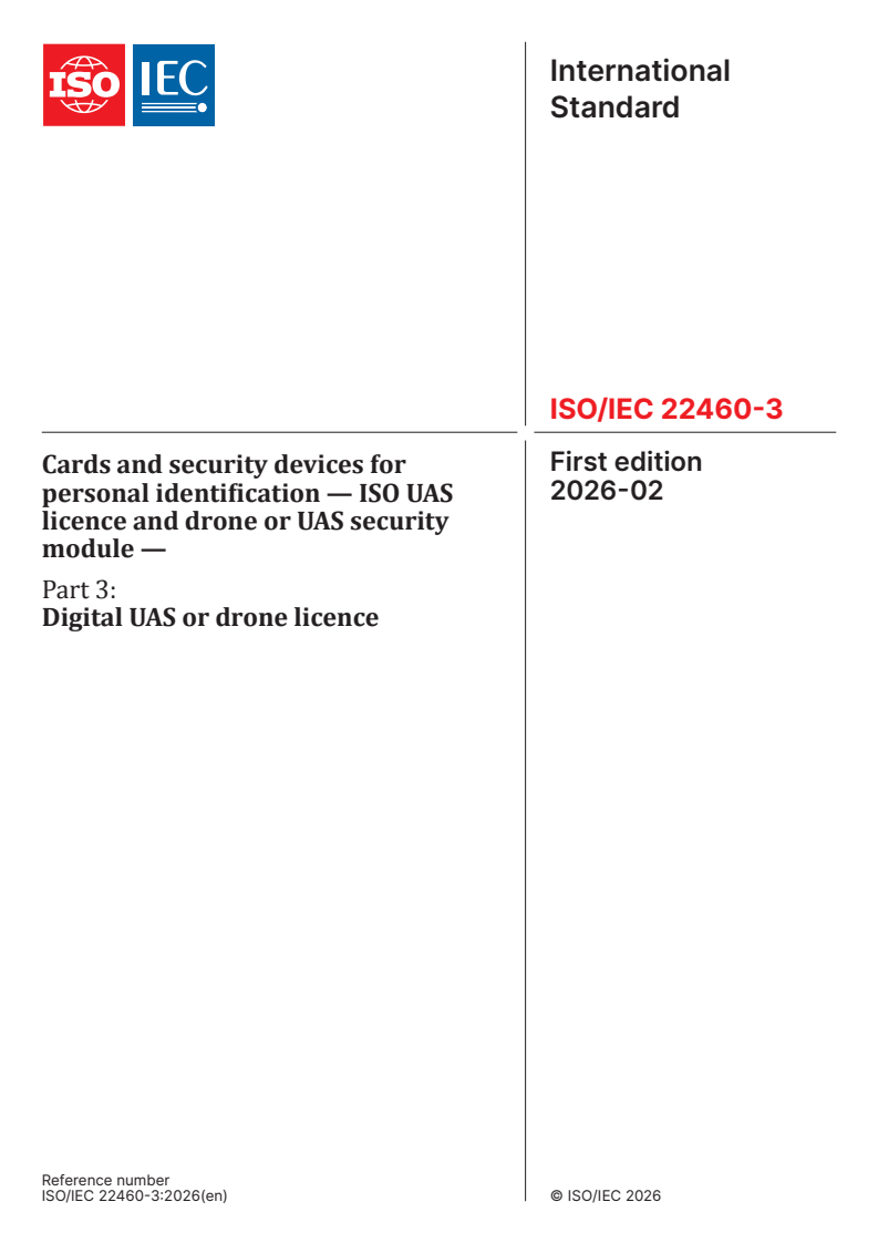 ISO/IEC 22460-3:2026 is a standard published by the International Organization for Standardization (ISO). Its full title is "Cards and security devices for personal identification — ISO UAS licence and drone or UAS security module — Part 3: Digital UAS or drone licence". This standard covers: The document specifies doctype, namespace and a set of data elements for digital UAS or drone licences (or training certificates) supporting mdoc data model specified in ISO/IEC 18013-5 and ISO/IEC TS 23220-2. This document is also applicable for any remote pilot licences or training certificates issued by aviation authorities. This document does not specify either licence categories and licence conditions and is designed to define any domestic licences and training certificates by defining domestic namespaces in accordance with each region and/or state’s regulations. The digital UAS or drone licence data specified in this document is applicable to mdoc application as defined in ISO/IEC 23220-1 and transmission protocol specified in ISO/IEC 18013-5, ISO/IEC TS 18013-7 and ISO/IEC TS 23220-4.