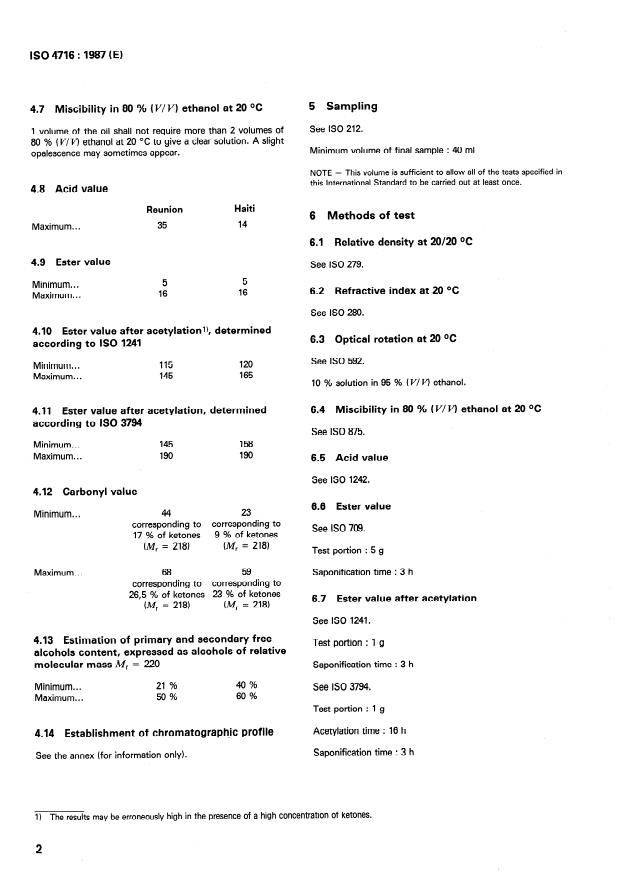 ISO 4716:1987 is a standard published by the International Organization for Standardization (ISO). Its full title is "Oil of vetiver (Vetiveria zizanioides (Linnaeus) Nash)". This standard covers: The Standard specifies certain characteristics of the oil, among others: Appearance: Viscous liquid. Colour: Brown to reddish brown. Odour: Characteristic. Relative density at 20/20 °C: 0,990 - 1,015 1); 0,986 - 0,998 2). Refractive index at 20 °C: 1,5220 - 1,5300 1); 1,5210 - 1,5260 2). Optical rotation at 20 °C: + 19 - + 30 1); + 22 - + 38 2). Solubility in 80 % (V/V) ethanol at 20 °C: 1 volume in not more than 2 volumes. Acid value: Maximum 35 1); 14 2). Ester value: 5 - 16. Carbonyl value: 44 - 68 1); 23 - 59 2). 1) Country of origin R union; 2) Country of origin Haiti