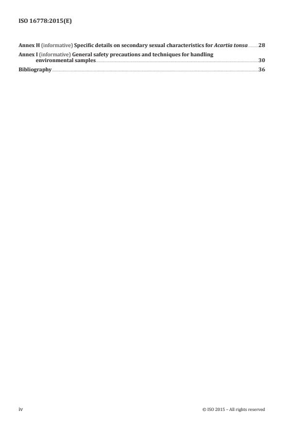 ISO 16778:2015 specifies an early-life stage test procedure for determination of the toxic effects of a chemical substance, effluent, or water sample on a cold-water marine and brackish water copepod species under semi-static conditions. The biological endpoints include survival and development of the early-life stages. The exposure starts with eggs and is continued until emergence of juvenile stages. Copepods occur widely in marine, brackish, and fresh water ecosystems. They represent important prey items for the larvae of many fish and larger invertebrates and are increasingly used as a live food source in aquaculture. They feed on phytoplankton and, thus, are an ecologically important energy-transfer link between primary producers and higher trophic levels.