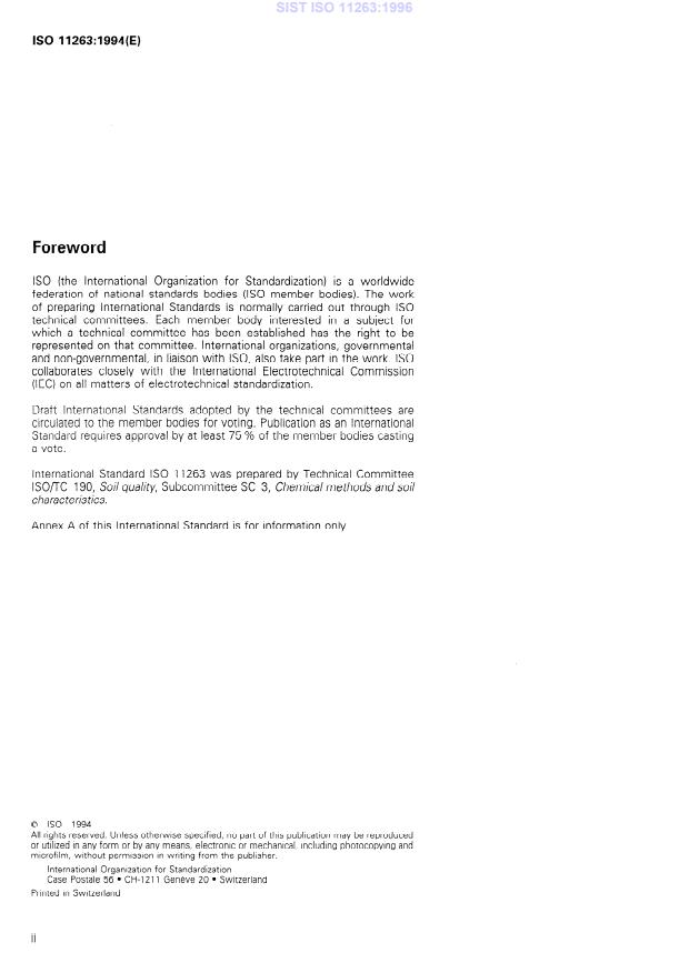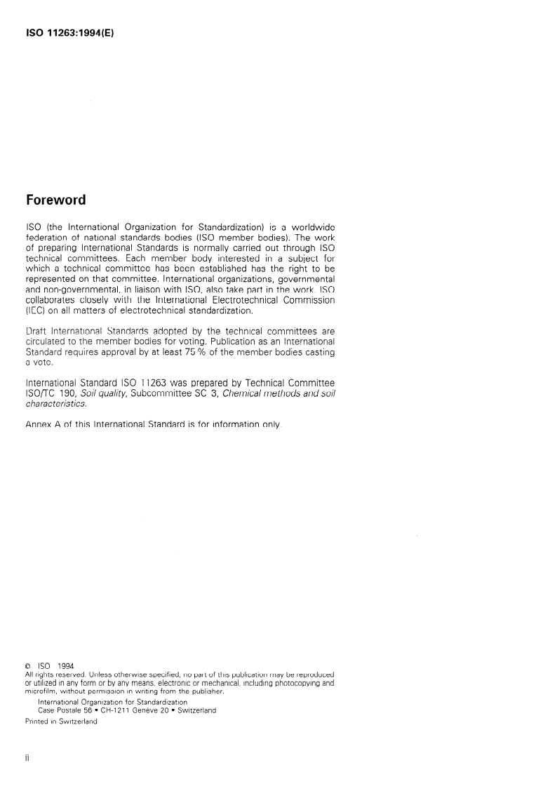 INTERNATIONAL STANDARD ISO 11263 First edition 1994-12-01 Soil quality - Determination of hosphorus - Spectrometric etermination of phosphorus soluble in sodium hydrogen carbonate solution QuaM du so/ - Dosage du Phosphore - Dosage spectrom&rique du Phosphore soluble dans une solutjon d’hydogenocarbonate de sodium Reference number ISO 11263:1994(E) SIST ISO 11263:1996