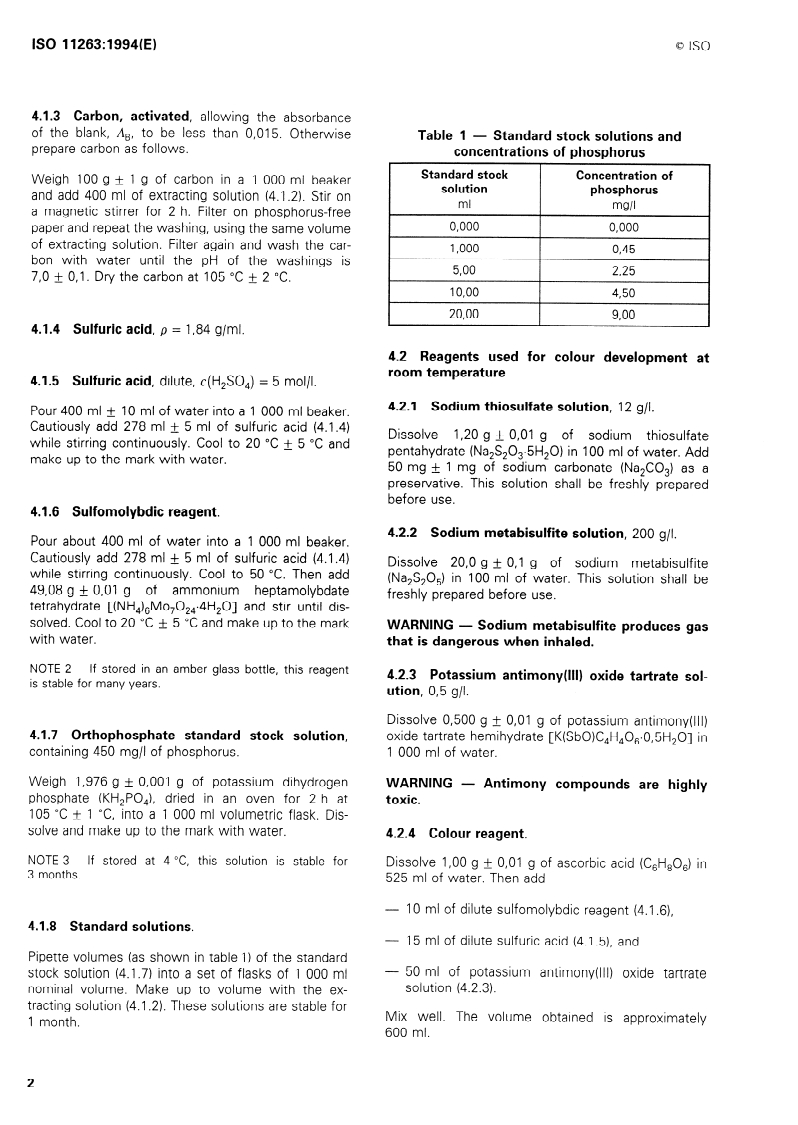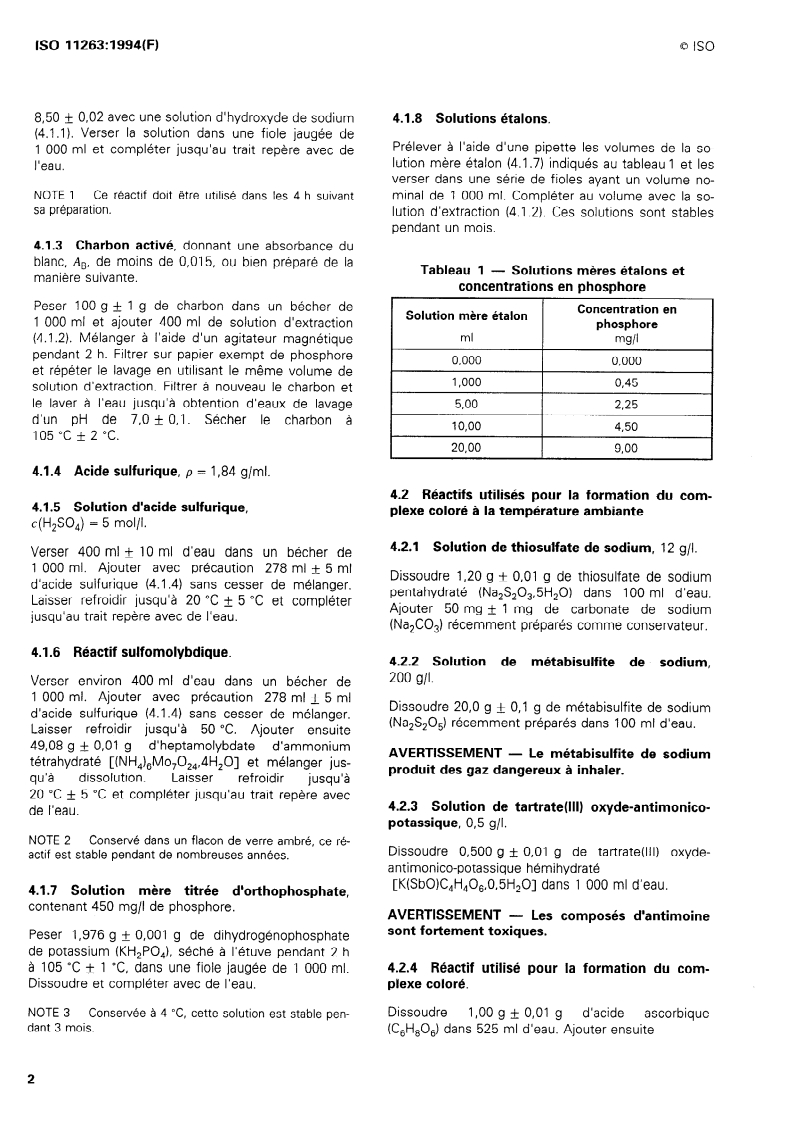 - Quality controls and repeatability: the standard defines calibration, blank procedures, and repeatability criteria (tolerance bands for different phosphorus concentration ranges). Detailed reagent formulations and preparation steps are provided.