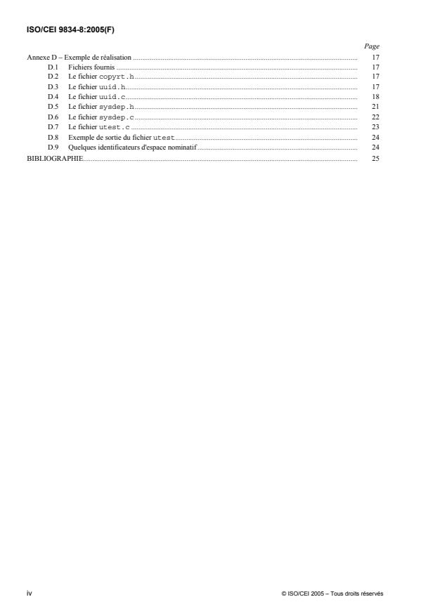 L'ISO/CEI 9834-8:2005 spécifie le format et les règles de génération qui permettent aux utilisateurs de générer des identificateurs de 128 bits qui sont soit garantis mondialement uniques ou sont mondialement uniques avec une haute probabilité. Les identificateurs UUID générés conformément à l'ISO/CEI 9834-8:2005 sont appropriés soit pour usage temporaire avec génération d'un nouvel identificateur UUID toutes les 100 ns, soit comme identificateurs permanents. L'ISO/CEI 9834-8:2005 est déduite de spécifications antérieures non normalisées concernant les identificateurs UUID et leur génération, et elle est techniquement identique à ces spécifications antérieures. Elle spécifie les procédures de fonctionnement d'un organisme d'enregistrement pour identificateurs UUID accessible par protocole IP. L'ISO/CEI 9834-8:2005 spécifie et permet également l'utilisation d'identificateurs UUID (enregistrés ou non enregistrés) comme composants d'identificateur OID au-dessous de l'arc {joint-iso-itu-t uuid(25)}. Cet usage permet aux utilisateurs de générer des identificateurs OID sans aucune procédure d'enregistrement. Elle spécifie et permet également l'utilisation des identificateurs UUID (enregistrés ou non enregistrés) afin de former un nom URN.