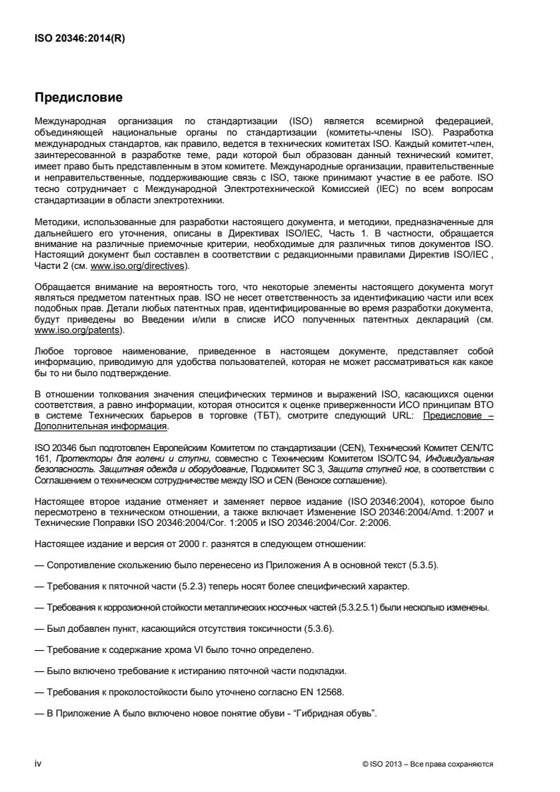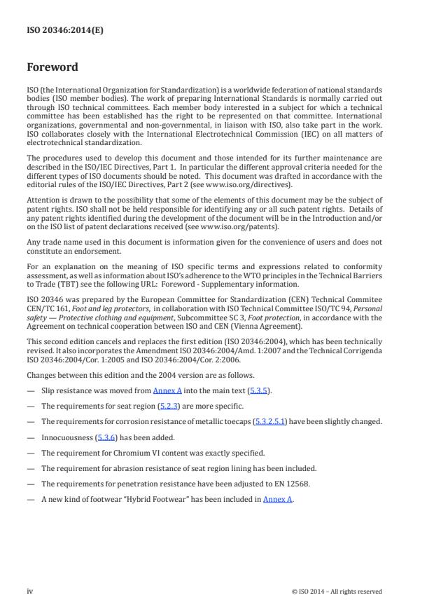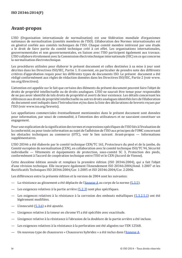 L'ISO 20346:2014 spécifie les exigences fondamentales et additionnelles (optionnelles) relatives aux chaussures de protection d'usage général. Elle inclut, par exemple, les risques mécaniques, la résistance au glissement, les risques thermiques et le comportement ergonomique. Les risques particuliers sont couverts par des normes complémentaires relatives au travail (par exemple chaussures pour pompiers, chaussures isolantes électriquement, chaussures résistantes aux coupures de scies à chaîne, protection contre les produits chimiques ou les projections de métal fondu, chaussures pour motocyclistes).