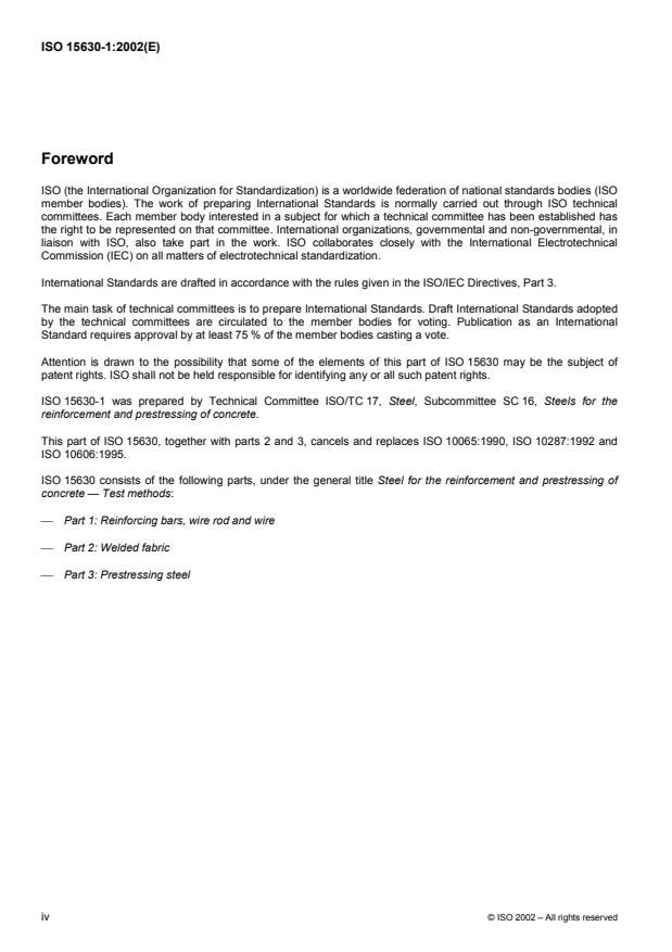 ISO 15630-1:2002 is a standard published by the International Organization for Standardization (ISO). Its full title is "Steel for the reinforcement and prestressing of concrete — Test methods — Part 1: Reinforcing bars, wire rod and wire". This standard covers: ISO 15630-1 specifies test methods applicable to steel reinforcing bars, wire rod and wire used for reinforcing and prestressing of concrete.