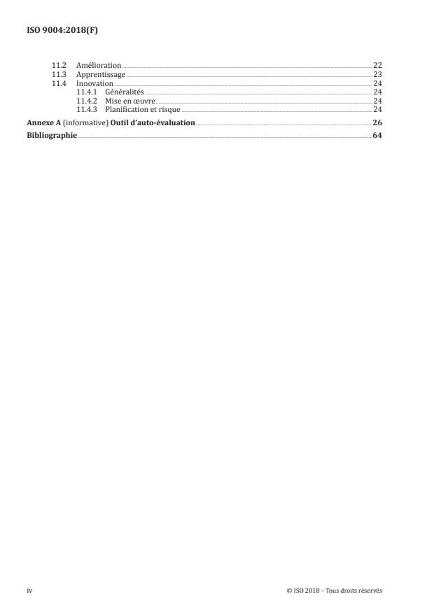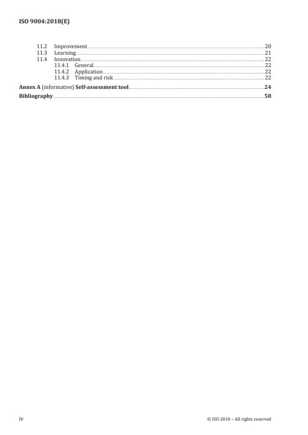 ISO 9004:2018 covers a broad set of organizational quality topics (as shown in its table of contents). Key areas include: