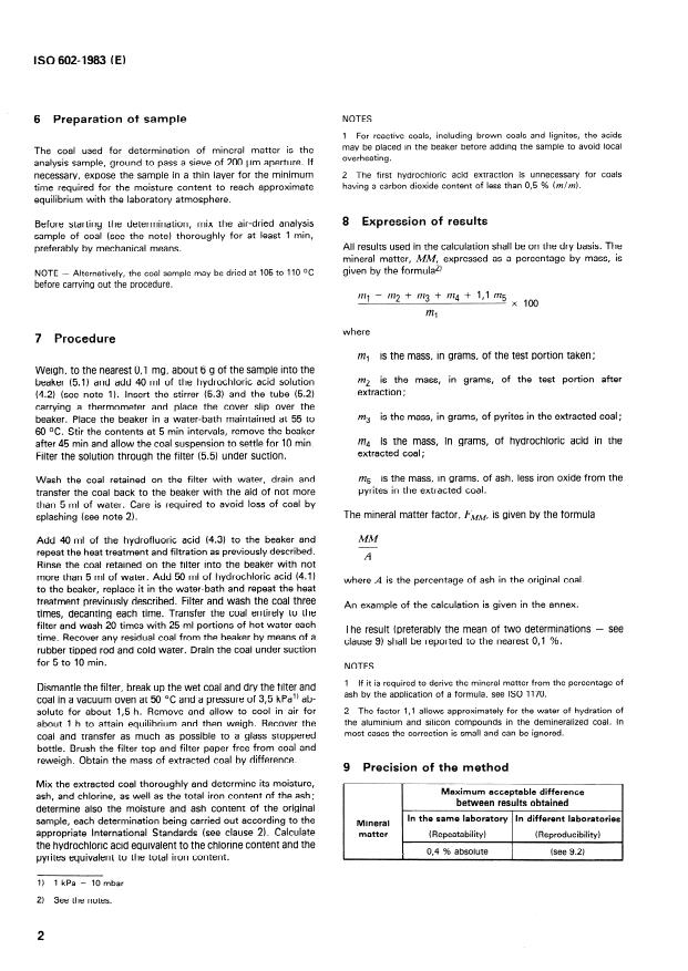 ISO 602:1983 is a standard published by the International Organization for Standardization (ISO). Its full title is "Coal — Determination of mineral matter". This standard covers: A sample of the coal is partially demineralized by treatment with hydrochloric and hydrofluoric acids under such conditions that coal substance remains unaffected. The loss in mass of the coal due the acid treatment is recorded and the undissolved part of the mineral matter is determined by ashing the partiallay demineralized coal. The iron copntent of the ash is determined so that the pyrites present in the extracted coal can be calculated. In addition the amount of hydrochloric acid absorbed by the coal substance is determined.