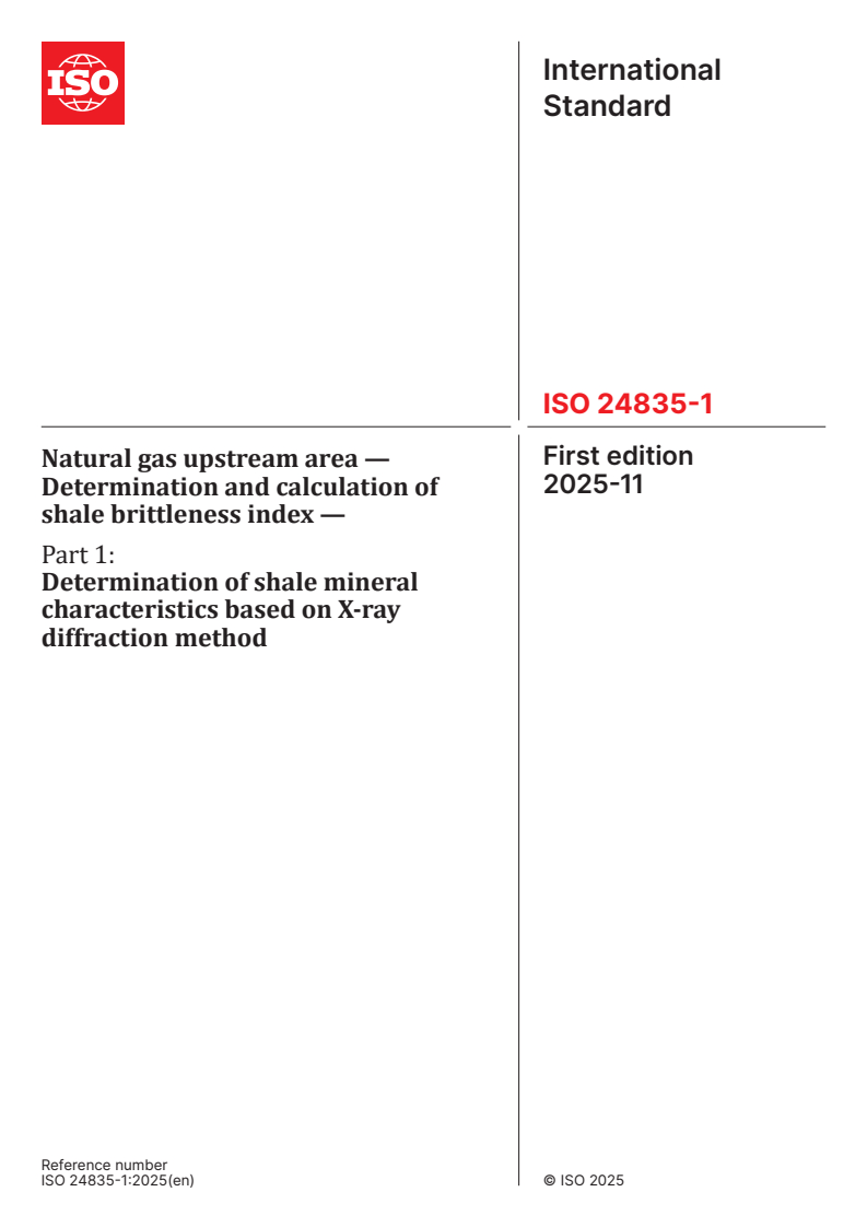 ISO 24835-1:2025 - Natural gas upstream area — Determination and calculation of shale brittleness index — Part 1: Determination of shale mineral characteristics based on X-ray diffraction method Released:11/24/2025