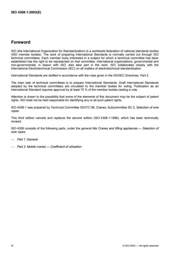 ISO 4308-1:2003 specifies two methods for the selection of wire rope to be used on lifting appliances as designated in ISO 4306-1, one based on the value of the rope selection factor C and the other based on the value of the coefficient of utilization Zp ISO 4308-1:2003 establishes the minimum requirements for acceptable strength and performance levels of wire ropes with respect to the design, application and maintenance of the lifting appliance. ISO 4308-1:2003 establishes the minimum requirements for the diameters of drums and sheaves that are to be associated with the selected wire rope.A non-exhaustive list of types of lifting appliance to which ISO 4308-1:2003 is applicable is given in Annex A. Annex B provides some examples of rope selection.Annex C gives factors, additional to those mentioned above, which may need consideration when selecting the wire rope.Annex D specifies the selection method for the diameter of the compensating sheave when used in relation to hoists.