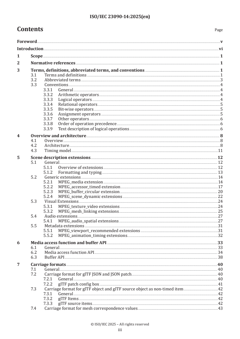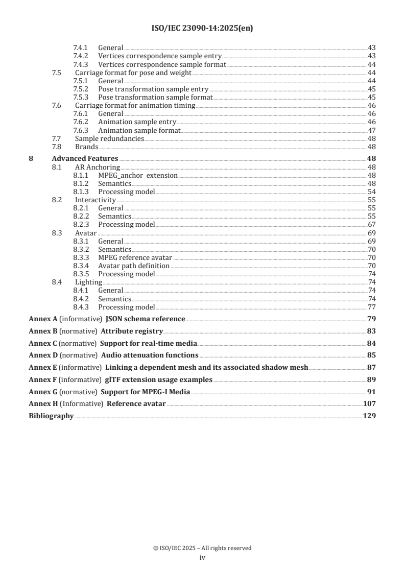 - Annexes: JSON schema references, attribute registries, real-time media support, glTF extension examples, and MPEG-I media support.