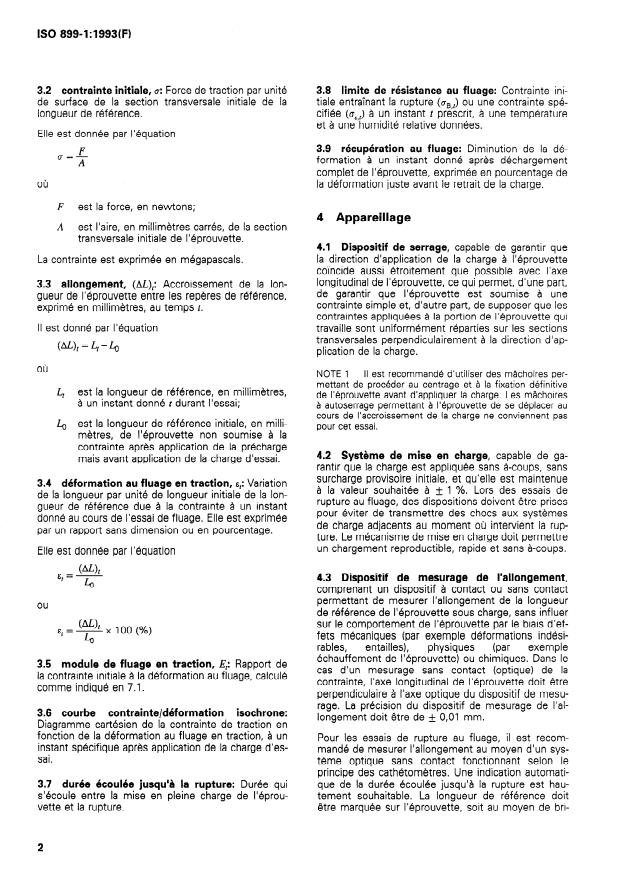 1.1 La présente partie de l'ISO 899 prescrit une méthode pour la détermination du fluage en traction des plastiques sous forme d'éprouvettes normalisées dans des conditions spécifiées, telles qu'en matière de traitement préalable, température et humidité. 1.2 La méthode peut être utilisée avec des plastiques rigides et semi-rigides (voir ISO 472 pour les définitions), non renforcés, chargés et renforcés par des fibres sous forme d'éprouvettes en forme d'haltères moulées directement ou usinées à partir de feuilles ou d'objets moulés. 1.3 La méthode peut permettre d'obtenir des données utiles pour la conception en ingénierie, la recherche et le développement. 1.4 Le fluage en traction peut dépendre étroitement des différences existant en matière de dimensions et préparation des éprouvettes ainsi qu'en ce qui concerne l'environnement d'essai. L'histoire thermique de l'éprouvette peut également influencer profondément son comportement au fluage (voir annexe A). En conséquence, lorsque des résultats comparatifs précis sont requis, ces facteurs doivent être contrôlés avec soin. 1.5 Si les caractéristiques de fluage en traction doivent être utilisées à des fins de conception en ingénierie, il convient de soumettre les plastiques à l'essai dans une large gamme de contraintes, durées et environnements.