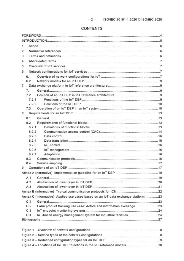 ISO/IEC 30161-1:2020(E) specifies requirements for an Internet of Things (IoT) data exchange platform for various services in the technology areas of: • the middleware components of communication networks allowing the co-existence of IoT services with legacy services; • the end-points performance across the communication networks among the IoT and legacy services; • the IoT specific functions and functionalities allowing the efficient deployment of IoT services; • the IoT service communication networks’ framework and infrastructure; and • the IoT service implementation guideline for the IoT data exchange platform