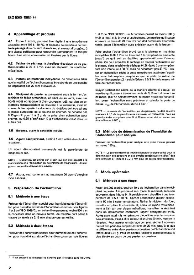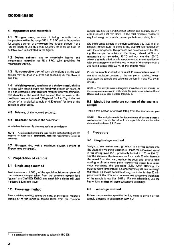 ISO 5068:1983 is a standard published by the International Organization for Standardization (ISO). Its full title is "Brown coals and lignites — Determination of moisture content — Indirect gravimetric method". This standard covers: Specifies two basic procedures: a) A single-stage method which can be used for determination of the total moisture content of the special moisture sample or of a moisture sample taken from a common sample. b) A two-stage method which can be used for determination of the residual moisture content and, if required, also the total moisture content of a special moisture sample or of a moisture sample taken from a common sample. The single-stage method consists in drying the sample to constant mass at a temperature of 105 to 110 °C under specified conditions. The two stage method contains additionally drying at temperaures not exceeding 40 °C.