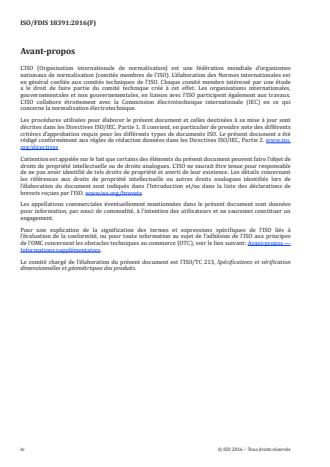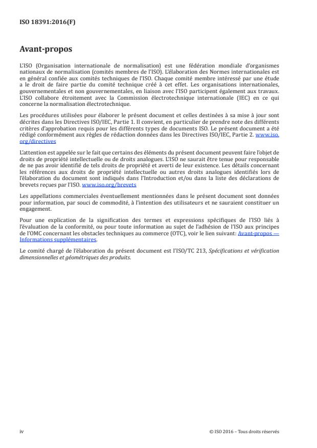 ISO 18391:2016 définit des règles pour établir et indiquer des spécifications de population, lesquelles sont utilisées pour spécifier des conditions se rapportant à des caractéristiques de population, établies à partir d'un ensemble de valeurs caractéristiques obtenues sur chaque pièce d'une population de pièces. Une spécification de population (applicable à une population de pièces considérée en tant que collection et non en tant qu'éléments individuels) peut être vue comme une exigence complémentaire à la spécification individuelle (applicable à chaque pièce considérée en tant qu'éléments individuels). Des spécifications de population expriment les hypothèses statistiques utilisées sur la population de pièces. NOTE 1 Une spécification de population est un complément à une spécification GPS individuelle. NOTE 2 ISO 18391:2016 n'a pas pour objectif d'imposer une méthode de tolérancement donnée ou une méthode de calcul des valeurs de tolérance. Son objectif est de spécifier les outils permettant d'exprimer des spécifications de population.
