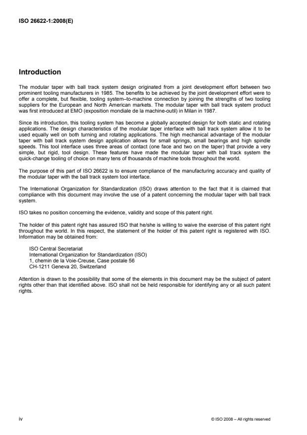 ISO 26622-1:2008 specifies the dimensions for a modular taper interface with ball track system: tapered shanks for automatic and manual tool exchange to be applied on machine tools (e.g. lathe machines, drilling machines, milling machines and turn/milling machine centres). A range of shank sizes is specified.