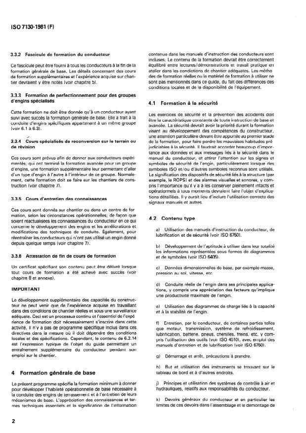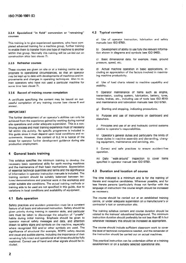 ISO 7130:1981 is a standard published by the International Organization for Standardization (ISO). Its full title is "Earth-moving machinery — Guide to procedure for operator training". This standard covers: Specifies the nature of operator training appropriate for earth-moving machinery. Does not specify any procedure for proficiency or assessment of competence of an operator's ability, since these factors are usually covered by local and national procedures and regulations. Applies to machines as defined in ISO 6165.