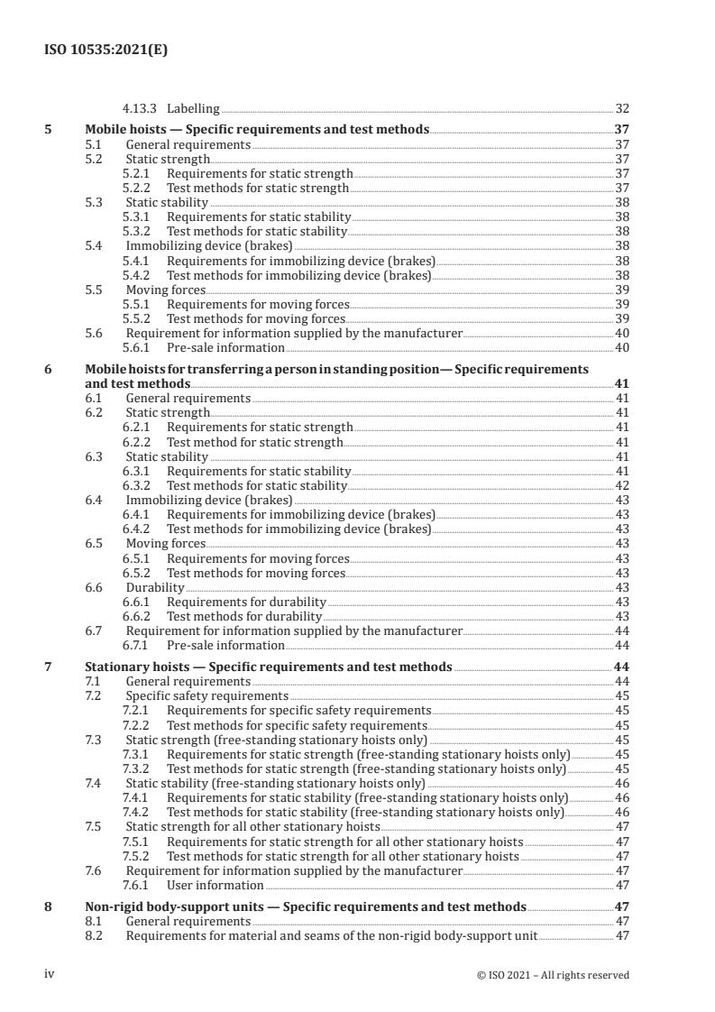 (ISO 10535 contains both general requirements and sections specific to mobile hoists, standing‑transfer hoists, stationary hoists, and non‑rigid body‑support units.)