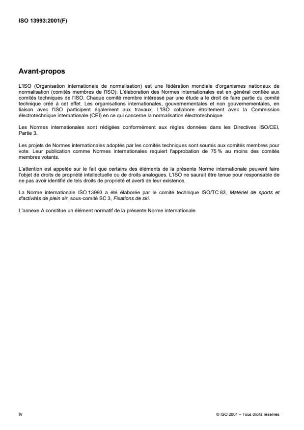 ISO 13993:2001 is a standard published by the International Organization for Standardization (ISO). Its full title is "Rental ski shop practice — Sampling and inspection of complete and incomplete alpine ski-binding-boot systems in rental applications". This standard covers: La présente Norme internationale spécifie une méthode uniforme d'échantillonnage et de contrôle des ensembles ski/fixation/chaussure de ski alpin complets ou incomplets dans le cadre de la location. Elle est destinée à tout organisme de location d'ensembles ski/fixation/chaussure complets ou incomplets (par exemple lorsque le client possède ses propres chaussures).