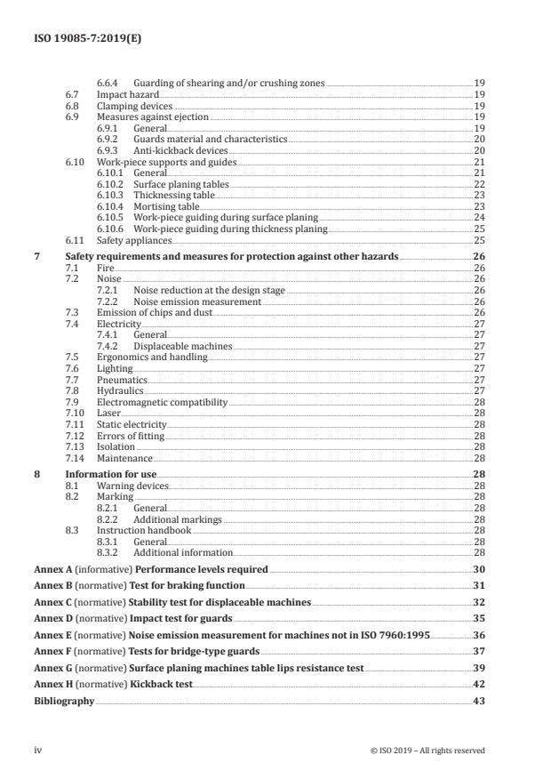 ISO 19085-7:2019 is a standard published by the International Organization for Standardization (ISO). Its full title is "Woodworking machines - Safety - Part 7: Surface planing, thickness planing, combined surface/thickness planing machines". This standard covers: This document gives the safety requirements and measures for stationary and displaceable - surface planing machines, also called jointers, - thickness planing machines, also called planers or single surface planers, - combined surface/thickness planing machines with fixed cutterblock position, with an integrated feed in thicknessing mode, with or without demountable power feed device in planing mode and with manual loading and unloading of the work-piece, hereinafter referred to as "machines". The machines are designed to cut solid wood and material with similar physical characteristics to wood. NOTE 1 For the definitions of stationary and displaceable machines, see ISO 19085‑1:2017, 3.4 and 3.5. It deals with all significant hazards, hazardous situations and events as listed in Clause 4 relevant to these machines when they are operated, adjusted and maintained as intended and under the conditions foreseen by the manufacturer including reasonably foreseeable misuse. Also, transport, assembly, dismantling, disabling and scrapping phases are taken into account. NOTE 2 For relevant but not significant hazards, e.g. sharp edges of the machine frame, see ISO 12100. It is also applicable to surface planing machines and combined surface/thickness planing machines fitted with an optional mortising device, whose hazards have been dealt with. This document does not apply to: a) machines with more than one cutterblock; b) machines with mortising unit driven by a separate motor; c) machines where the cutterblock is adjustable for depth of cut setting in thicknessing mode; d) machines where the conversion from planing to thicknessing mode or vice versa is achieved by mounting or demounting parts/units; e) machines where surfacing and thicknessing can be performed on the same section of the cutterblock at the same time; f) machines intended for use in potentially explosive atmosphere; g) machines manufactured before the date of its publication as an international standard; h) displaceable machines with a maximum planing width of ≤330 mm. NOTE 3 Transportable motor-operated electric tools are dealt with in IEC 62841‑1:2014 and IEC 61029‑2‑3:1993.