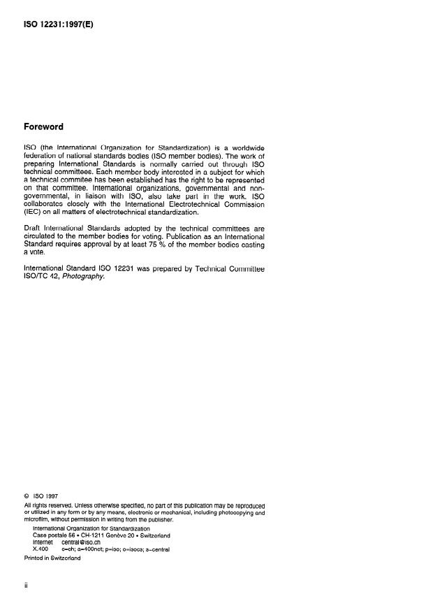 ISO 12231:1997 is a standard published by the International Organization for Standardization (ISO). Its full title is "Photography — Electronic still-picture cameras — Terminology". This standard covers: Photography — Electronic still-picture cameras — Terminology