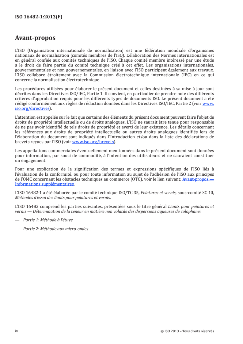 L'ISO 16482-1:2013 spécifie une méthode de détermination de la teneur en matière non volatile, en masse, des dispersions aqueuses de colophane par étuvage. Cette méthode est applicable aux dispersions de résine dont le point de ramollissement, mesuré conformément à l'ISO 4625‑1 (méthode de l'anneau et de la bille), est compris entre 60 °C et 100 °C.