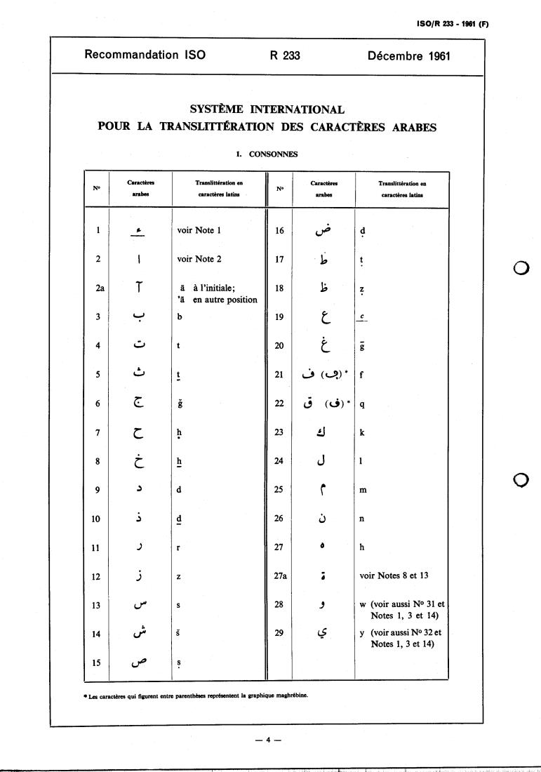 ISO/R 233:1961 - International system for the transliteration of Arabic characters