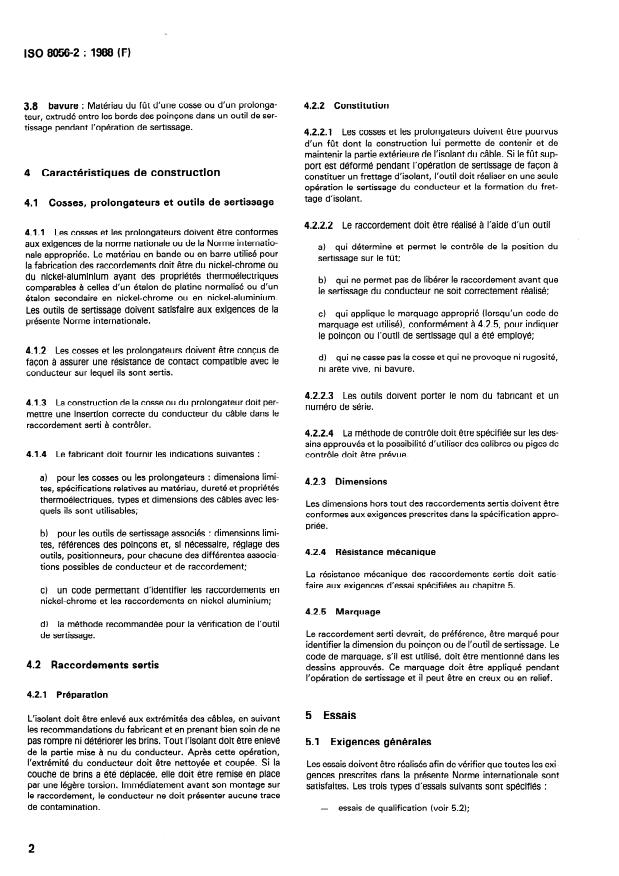 ISO 8056-2:1988 is an International Organization for Standardization (ISO) standard that defines general requirements and tests for terminations used on nickel‑chromium (Ni‑Cr) and nickel‑aluminium (Ni‑Al) thermocouple extension cables for aircraft. The standard covers the design, construction, crimping procedure and verification tests for non‑insulated crimp terminations (cosses / ferrules) applied to the standard flexible conductors of thermocouple extension cables so that thermoelectric integrity and constancy of resistance of the thermocouple circuit remain within specified limits.