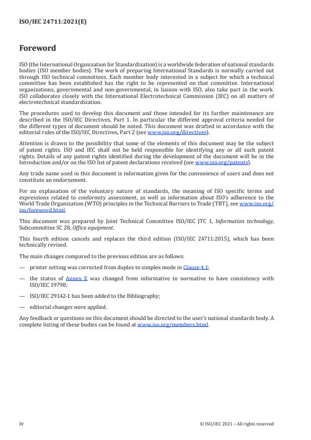 ISO/IEC 24711:2021 is a standard published by the International Organization for Standardization (ISO). Its full title is "Information technology — Office equipment — Method for the determination of ink cartridge yield for colour inkjet printers and multi-function devices that contain printer components". This standard covers: The scope of this document is limited to the evaluation of ink cartridge page yield for ink-containing cartridges (i.e. integrated ink cartridges and ink cartridges without integrated printheads) for colour inkjet print systems. This document can also be applied to the printer component of any multifunctional device that has a digital input printing path, including multi-function devices that contain inkjet printer components. Both liquid and solid ink products can be tested using this document. This document is only intended for the measurement of ink cartridge page yield when printing on plain paper. No other claims can be made from this testing regarding quality, reliability, etc. This document can be used to measure the yield of any cartridge that is used in a significant amount during the printing of the test page suite defined in ISO/IEC 24712. This document is not for use with printers whose minimum printable size is equal to or greater than A3 or for printers designed or configured to print photos (for example, maximum printable size less than A4 or a printer configuration intended for photo-only printing). In addition, it only applies to drop-on-demand printing systems. NOTE Integrated ink cartridges is a cartridge that includes at least: an ink containment part, an ink deposition mechanism and an ink transport part (see ISO/IEC 29142-1).