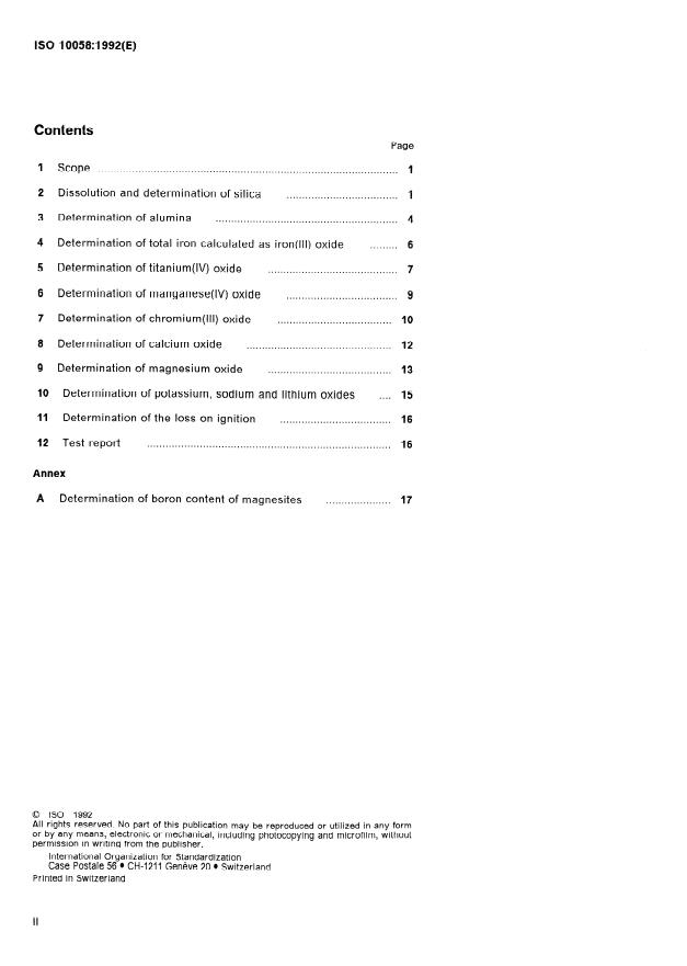 ISO 10058:1992 is a standard published by the International Organization for Standardization (ISO). Its full title is "Magnesites and dolomites — Chemical analysis". This standard covers: Specifies methods for determining silica, alumina, titania, iron oxide and oxides of manganese, chromium, calcium, magnesium, sodium, potassium and lithium. It also specifies methods for determining the loss of ignition of magnesite and dolomite, and of refractories based on these raw materials. Annex A describes a method for determining the boron content of magnesites only.