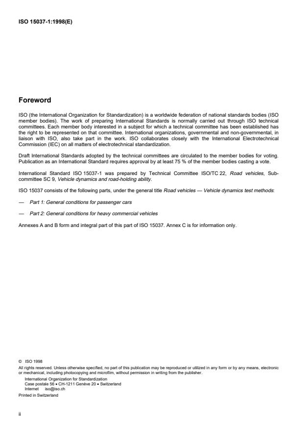 ISO 15037-1:1998 is a standard published by the International Organization for Standardization (ISO). Its full title is "Road vehicles — Vehicle dynamics test methods — Part 1: General conditions for passenger cars". This standard covers: Road vehicles — Vehicle dynamics test methods — Part 1: General conditions for passenger cars