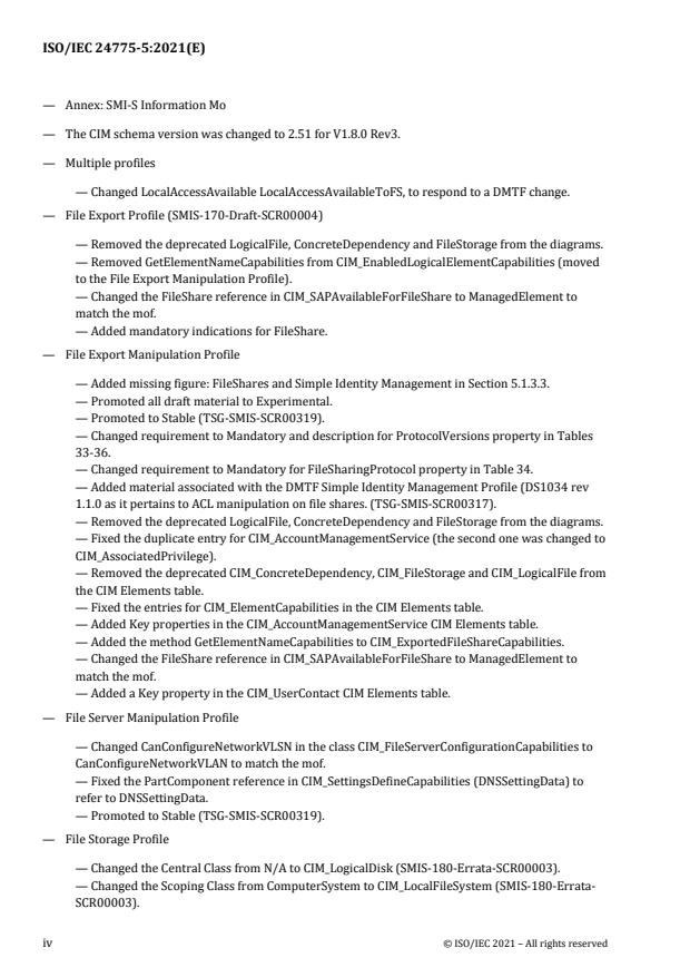 ISO/IEC 24775-5:2021 is a standard published by the International Organization for Standardization (ISO). Its full title is "Information technology — Storage management — Part 5: File systems". This standard covers: Storage Management Technical Specification, Part 2 Common Architecture, 1.8.0 Rev 4 defines the core architecture and protocols in SMI-S. The components of SMI-S architecture include: Transport - communicating management information between constituents of the management system Health and fault management - detecting failures through monitoring the state of storage components General information about the object model Names - how SMI-S uses names to allow applications to correlate across SMI-S and to other standards Standard messages - how exceptions are presented to client applications Service discovery - techniques clients use to discover SMI-S services Installation and upgrade - recommendations for implementations Compliance - requirement for compliance to the standard