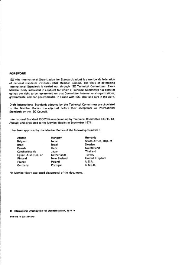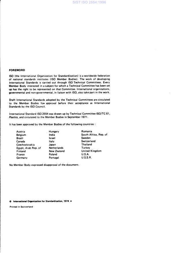 FOREWORD IS0 (the International Organization for Standardization) is a worldwide federation of national standards institutes (IS0 Member Bodies). The work of developing International Standards is carried out through IS0 Technical Committees. Every Member Body interested in a subject for which a Technical Committee has been set up has the right to be represented on that Committee. International organizations, governmental and non-governmental, in liaison with ISO, also take part in the work. Draft International Standards adopted by the Technical Committees are circulated to the Member Bodies fob approval before their acceptance as International Standards by the IS0 Council. International Standard IS0 2554 was drawn up by Technical Committee ISO/TC 61, Plastics, and circulated to the Member Bodies in September 1971. It has been approved by the Member Bodies of the following countries Austria Belgium Brazil Canada Czechoslovakia Egypt, Arab Rep. of Finland France Germany Hungary India Israel Italy Japan Netherlands New Zealand Poland Portugal No Member Body expressed disapproval of the document. Romania Nuth Africa, Rep. of Sweden Switzerland Thailand Turkey United Kingdom U.S.A. U.S.S.R. O Intariutiond Omniution for Standardization, 1974 Printed in Switzerland SIST ISO 2554:1996