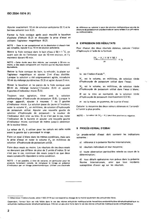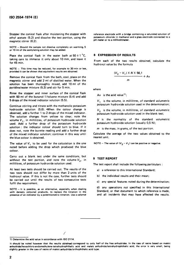 INTE RNATl ONAL STANDARD IS0 2554-1974 (E) Plastics - Unsaturated polyester resins - Determination of hydroxyl value 1 SCOPE AND FIELD OF APPLICATION This International Standard specifies a method for determining the hydroxyl value of unsaturated polyester resins. In fact, this method determines the difference between the hydroxyl value and the acid value; it is therefore necessary to determine the acid value separately, in order to calculate the hydroxyl value. NOTE - The hydroxyl yalue of saturated polyester resins (for example, polyester resin used for the manufacture of polyurethanes and polymeric plasticizers) and of certain types of alkyd resins may also be determined by this method. 2 REFERENCE IS0 21 14, Plastics - Unsaturated polyester resins - Determination of acid value. 3 DEFINITION hydroxyl value : The number of milligrams of potassium hydroxide necessary to neutralize the acetic acid which will combine by acetylation with 1 g of the unsaturated polyester resin. 4 PRINCIPLE Acetylation of the hydroxyl groups by acetic anhydride is carried out on an ethyl acetate solution of the resin in the presence of toluene-4-sulphonic acid catalyst. The excess acetic anhydride is hydrolyzed by a pyridine/water mixture and the resultant acetic acid titrated with standard volumetric methanolic potassium hydroxide solution. In this titration, the free acid groups which exist in the resin are also neutralized by the potassium hydroxide. The hydroxyl value is finally calculated by taking into account the acid value determined separately. 5 REAGENTS 5.1 Acetic anhydride acetylating solution, approximately 1 M, in ethyl acetate. Dissolve 1,4 g of pure, dry toluene-4-çulphonic acid in 111 ml of anhydrous ethyl acetate. When completely dissolved, slowly add, while mixing, 12 ml of freshly distilled acetic anhydride and store in a dry atmosphere. 5.2 Ethyl acetate, anhydrous 5.3 Pyridine/water mixture, 3 + 2 (V/V). Mix 3 volumes of pyridine, analytical reagent quality, with 2 volumes of water. 5.4 Butanol-l/toluene mixture, 2 + 1 (V/V) 5.5 Mixed indicator solution. Mix 3 volumes of a 0,l % ethanolic solution of thymol blue with 1 volume of a 0.1 % ethanolic solution of cresol red. 5.6 Potassium hydroxide, 0,5 N standard volumetric solution in methanol. 6 APPARATUS Ordinary laboratory apparatus, and 6.1 Conical flask, capacity 250 ml, with a ground glass stopper. 6.2 Magnetic stirrer, with a magnetic bar covered with a corrosion-resistant material (for example PTFE). 6.3 Burette, capacity 50 ml, graduated in 0,05 ml. 6.4 Water bath, controlled a
