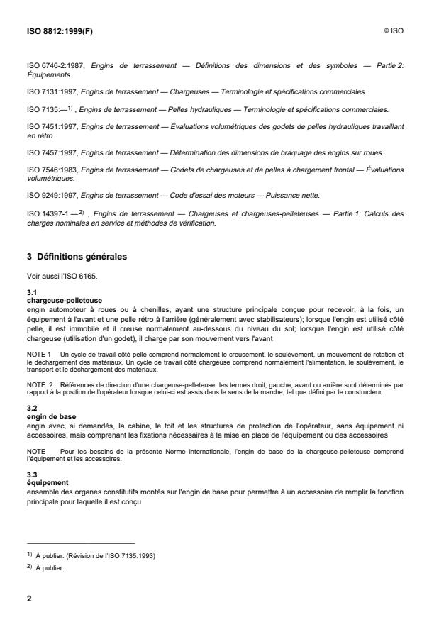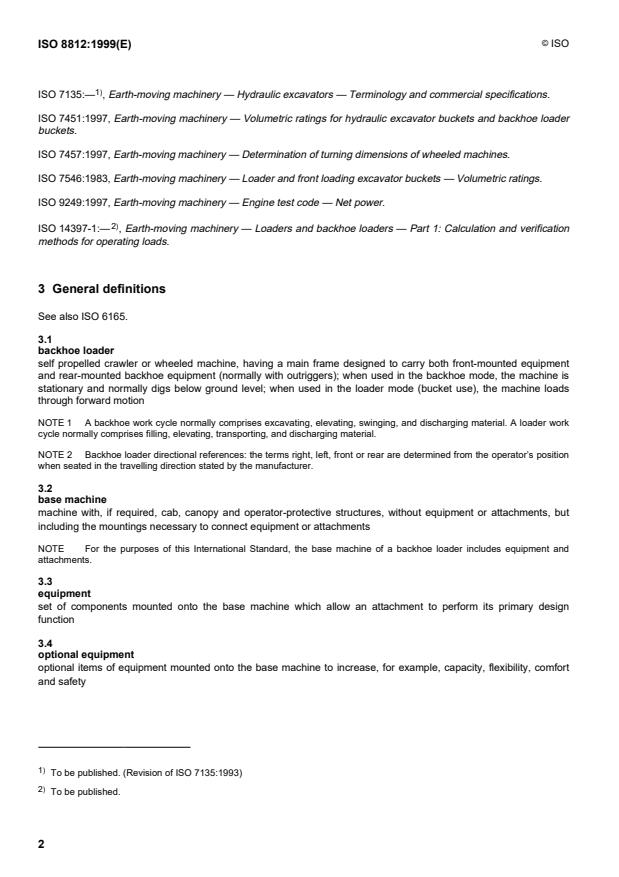 ISO 8812:1999 is a standard published by the International Organization for Standardization (ISO). Its full title is "Earth-moving machinery - Backhoe loaders - Definitions and commercial specifications". This standard covers: La présente Norme internationale établit la terminologie et fixe le contenu des spécifications des documents commerciaux pour les chargeuses-pelleteuses automotrices sur roues et sur chenilles et leurs équipements.La présente Norme internationale s'applique aux chargeuses-pelleteuses telles que définies au paragraphe 3.1. Elle ne couvre pas les chargeuses équipées d'une pelle rétro telle que définie dans l'ISO 7131:1997, 3.3.1.