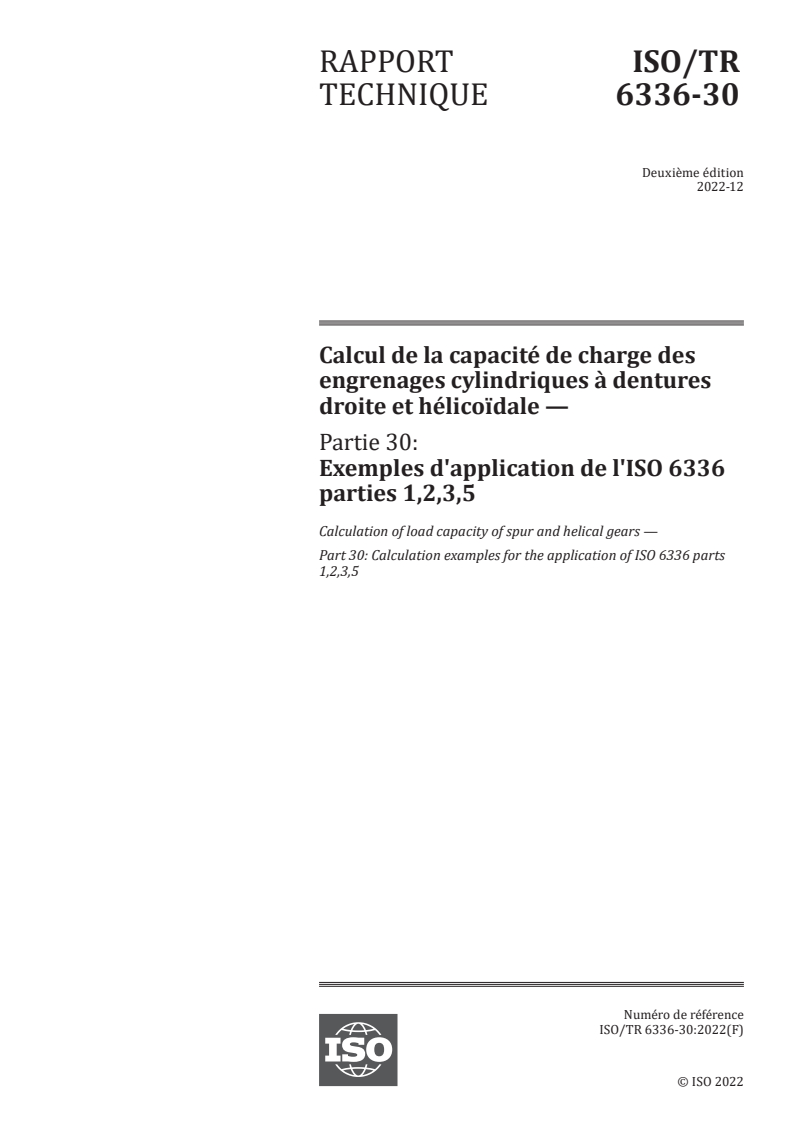 ISO/TR 6336-30:2022 - Calcul de la capacité de charge des engrenages cylindriques à dentures droite et hélicoïdale — Partie 30: Exemples d'application de l'ISO 6336 parties 1,2,3,5 Released:3/7/2023