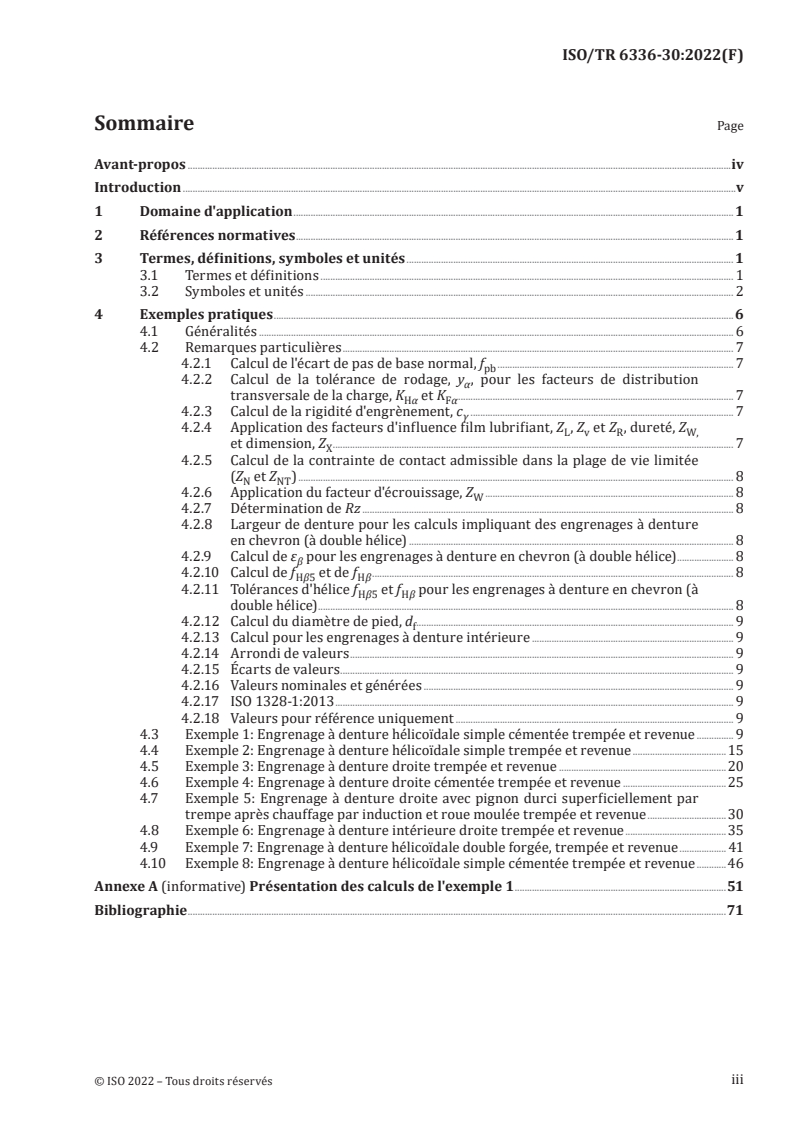 Le présent document fournit des exemples pratiques qui appliquent exclusivement les méthodes d'approximation permettant de déterminer des facteurs d'influence spécifiques, tels que le facteur dynamique, Kv, et les facteurs de distribution de charge, KHα, KHβ, etc., pour lesquelles des méthodes de calcul analytiques complètes sont fournies dans les parties référencées de l'ISO 6336. Les exemples pratiques couvrant des méthodes et des techniques d'analyse plus avancées ne s'appliquent pas au présent document. Les exemples de calcul donnés dans le présent document sont fournis à titre indicatif pour l'application des ISO 6336-1:2019, ISO 6336-2:2019, ISO 6336-3:2019 et ISO 6336-5:2016. Aucune des valeurs, aucun des coefficients de sécurité, ni aucune des données présentés ne représentent les critères recommandés pour des engrenages réels. Les données qui figurent dans le présent document visent à faciliter l'application des méthodes de calcul des ISO 6336-1, ISO 6336-2, ISO 6336-3 et ISO 6336-5.