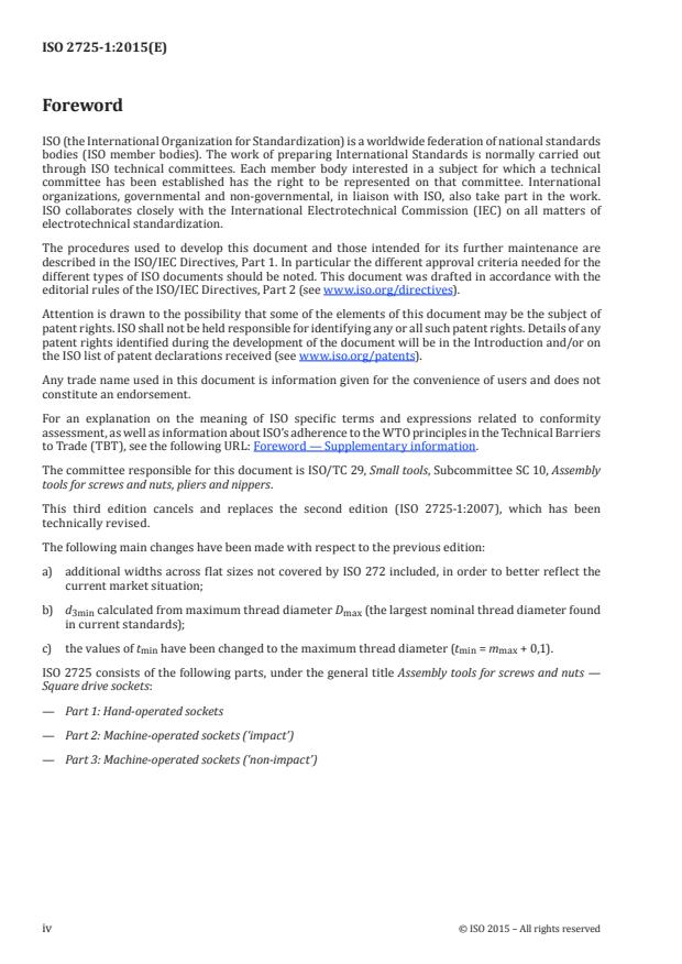 ISO 2725-1:2015 is a standard published by the International Organization for Standardization (ISO). Its full title is "Assembly tools for screws and nuts — Square drive sockets — Part 1: Hand-operated sockets". This standard covers: ISO 2725-1:2015 specifies dimensions, the designation, and the marking of hand-operated square drive sockets with operating end and having a hexagonal or double hexagonal form in accordance with ISO 1174‑1. NOTE 1 Hand-operated square drive sockets are listed under number 2 1 02 01 0 in ISO 1703. NOTE 2 The figures in this part of ISO 2725 are given only as examples. They are not intended to influence the manufacturer's design.