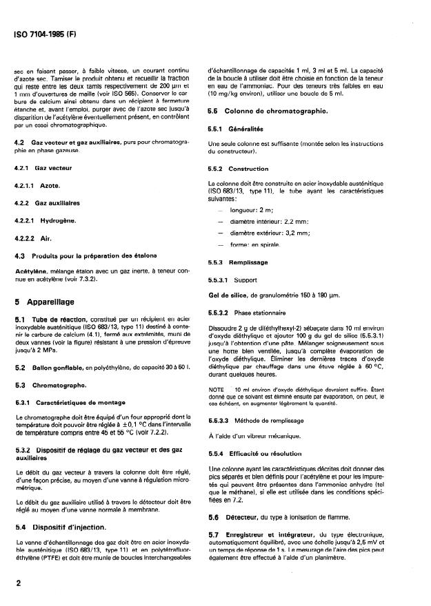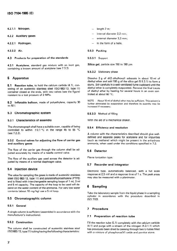 ISO 7104:1985 is a standard published by the International Organization for Standardization (ISO). Its full title is "Liquefied anhydrous ammonia for industrial use — Determination of water content — Gas chromatographic method". This standard covers: The water present in a sample is tranformed into acetylene by reaction with calcium carbide. The acetylene formed is determined by gas chromatography using an external standard consisting of a standard gas mixture with an inert gas, containing a known amount of acetylene. The method is applicable to products having water contents between 5 mg/kg and 3000 mg/kg.