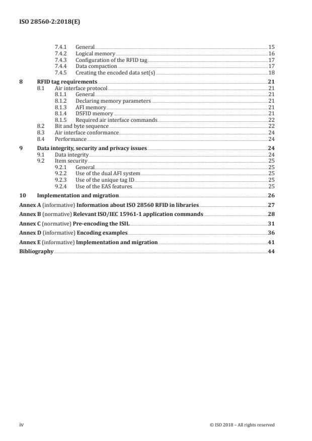 Ta dokument določa podatkovni model in pravila kodiranja za uporabo oznak za radiofrekvenčno prepoznavo (RFID) za elemente, primerne za potrebe vseh vrst knjižnic (vključno z nacionalnimi, akademskimi, javnimi, poslovnimi, posebnimi in šolskimi knjižnicami). Pravila za šifriranje podniza podatkovnih elementov, izvzetih iz celotnega niza podatkovnih elementov iz standarda ISO 28560-1, temeljijo na standardu ISO/IEC 15962, ki uporablja strukturo identifikatorja objekta za določitev podatkovnih elementov.