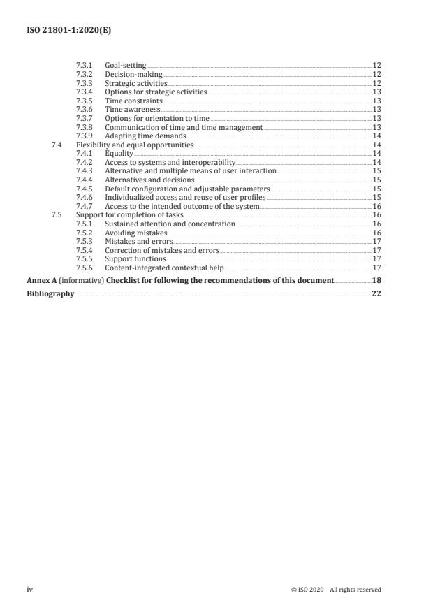 ISO 21801-1:2020 is a standard published by the International Organization for Standardization (ISO). Its full title is "Cognitive accessibility — Part 1: General guidelines". This standard covers: This document presents guidelines for the design and development of cognitively accessible systems, including products and services and built environments. This document is relevant to mainstream systems as well as those designed specifically for people with disability. Within the broad field of accessibility, this document is limited to guidance related to cognitive accessibility. NOTE 1 It acknowledges, however, that diverse sensory perceptions can impact cognitive accessibility. NOTE 2 While the following guidance in this document can benefit all users, it is included here because failure to follow it could lead to barriers that would prevent some potential users from being able to use the system at all. This document is relevant to all types of systems. However, some particular recommendations can only be followed for some types of systems: — Some of the guidance is relevant to a fixed system (e.g. a non-computerized consumer product or a user manual); — Some of the guidance applies to systems containing some level of computer-based processing (e.g. a microwave oven or an ICT-system); — Some of the guidance applies to systems that use advanced computer processing that supports individualization (e.g. an application in a smart phone); — Some guidance applies to combinations of the above.